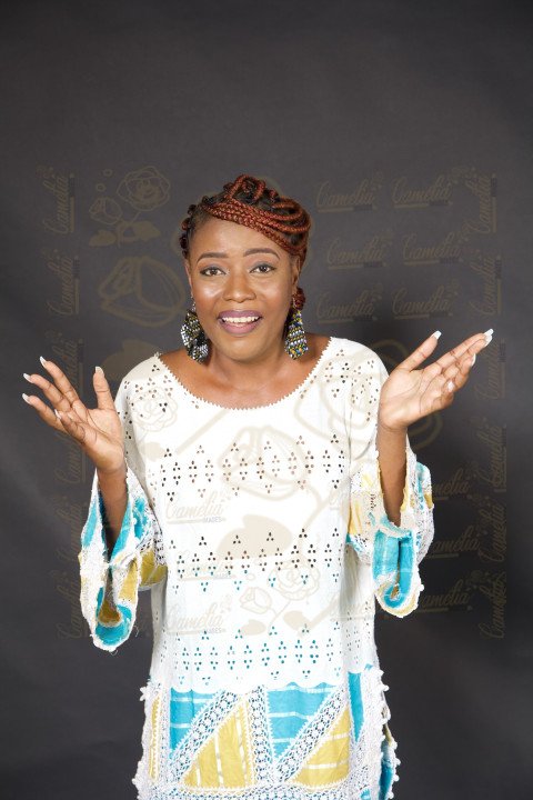 Femme africaine cheveux noire bouquet fleurs jaune vert rose grand sourire