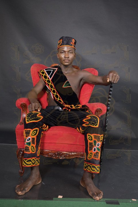 Homme noir africain tenue traditionnelle assis fauteuil rouge