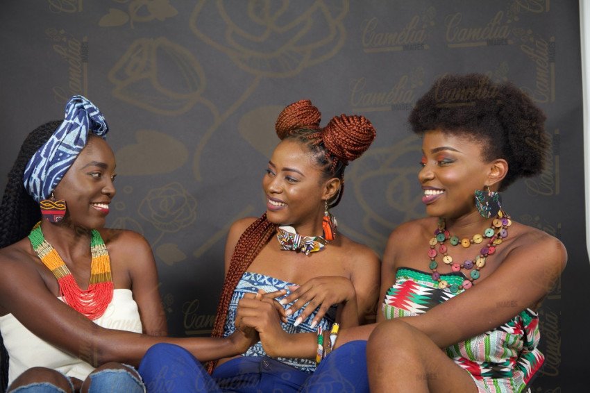 femme jeune belle naturel jolie sourire boucles oreilles foulard afritude coiffure rastas afro colliers pantalon bleu rouge a lèvres teint claire teint noir dialogue charme douceurSimilar Photos