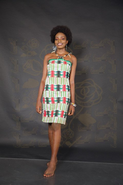 Une belle jeune femme noire, souriante, vêtue d'une robe simple,élégante, prenant une pose élegante.