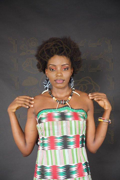 Maman africaine sourire ensemble pagne foulard sac main rouge lèvre bijoux