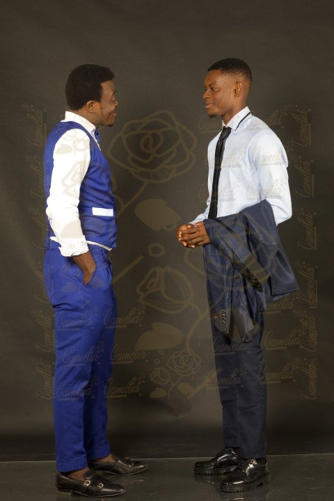 Frères jumeaux elegants style moderne bretelles main poches sourire