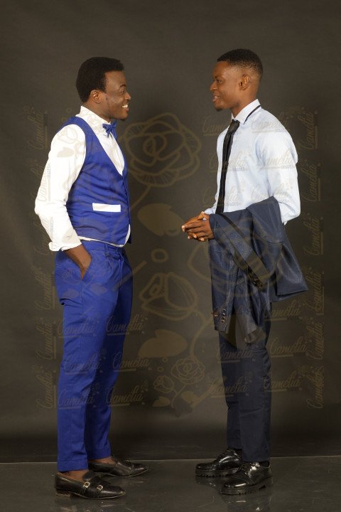 Jeune homme africain en costume violet cravate et femme en veste bleu talon rouge