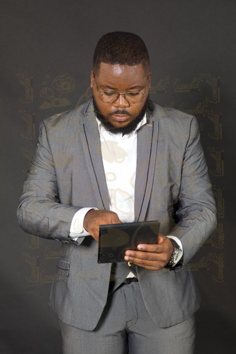 homme noir beau elegant costume uniforme couleur grise montre lunette yeux baissé business finance tablette communication internet smartphoneSimilar Photos