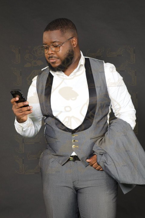 Jeune homme africain teint claire tenue Afrique pantalon noir tennis blanche téléphone