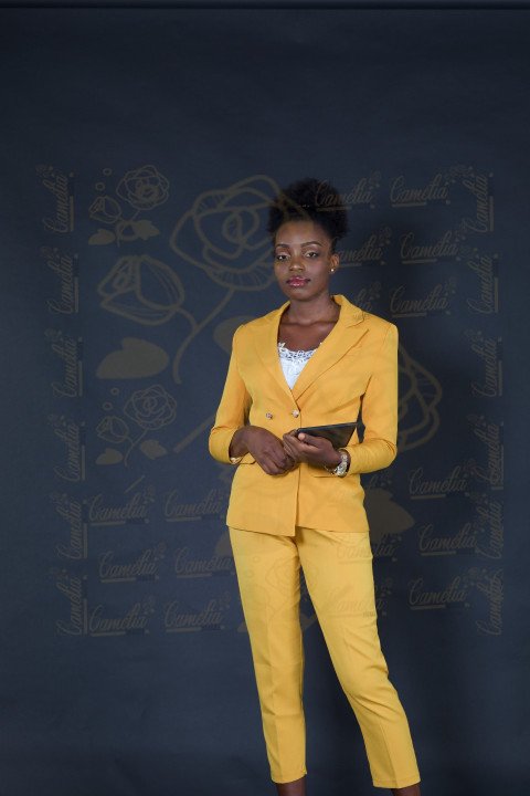 Femme affaire africaine veste jaune posture mannequin sac a main pagne