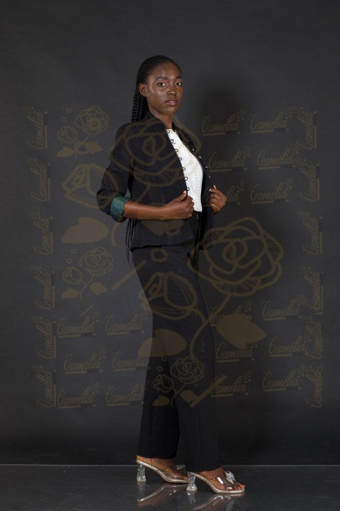 Femme affaire africaine veste noire posture mannequin main sur la joue pensif