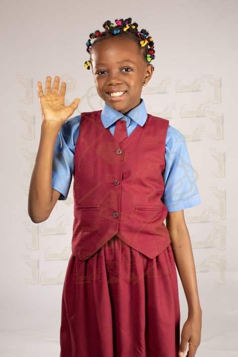 petite écolière africaine tenue classe mains reins jolie sourire regard