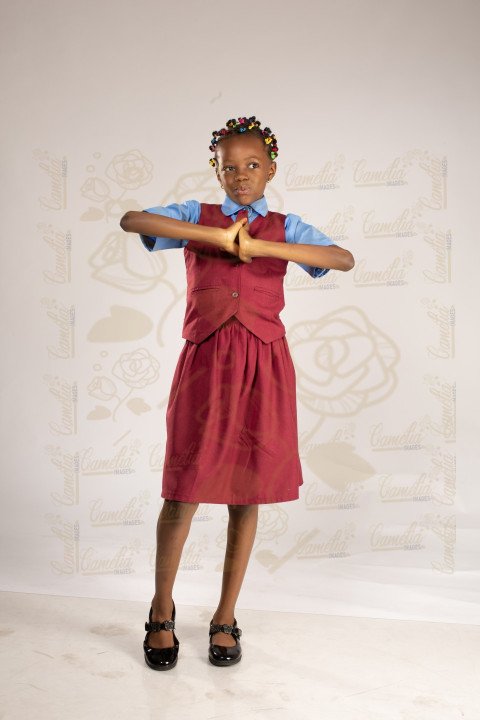 Petite écolière tenue classe mains reins coiffure matoba chaussures noire