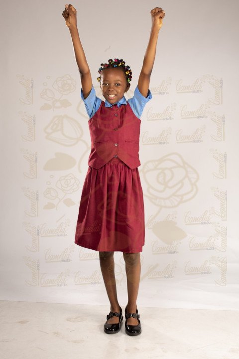 Petite écolière tenue classe couleur bordeaux montre rouge coiffure petits matoba multicolors