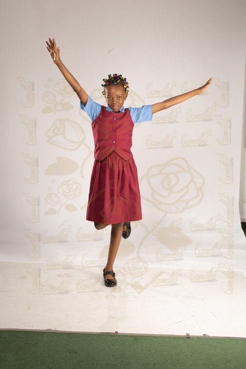 Jeune petite fille africaine belle grand sourire tenue classe chaussures noires coiffure matoba