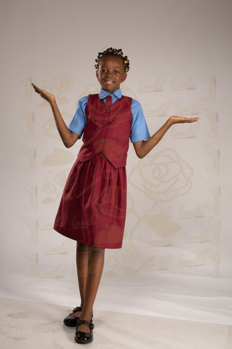 petite écolière africaine tenue classe mains reins jolie sourire gestuel grimasse