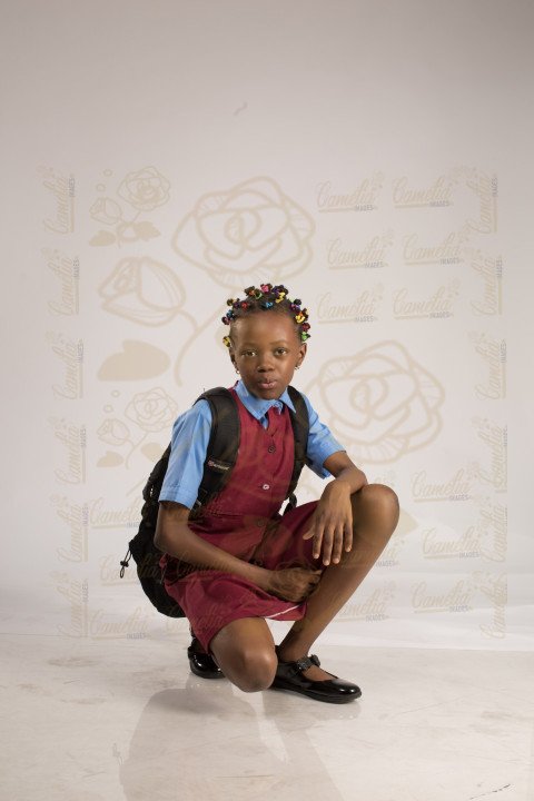 Petite écolière africaine tenue classe gestuel posture mannequin salutation chaussures noires