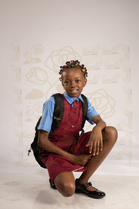 petite écolière africaine tenue classe mains reins jolie sourire regard