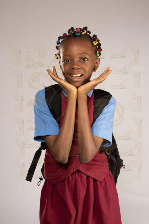 petite écolière africaine tenue classe mains reins jolie sourire regard