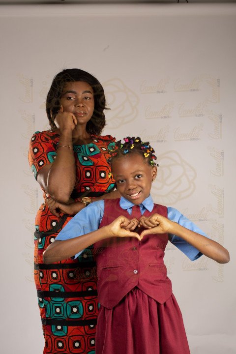 Mère et jeune petite écolière africaine gestuel salutation sourire uniforme scolaire