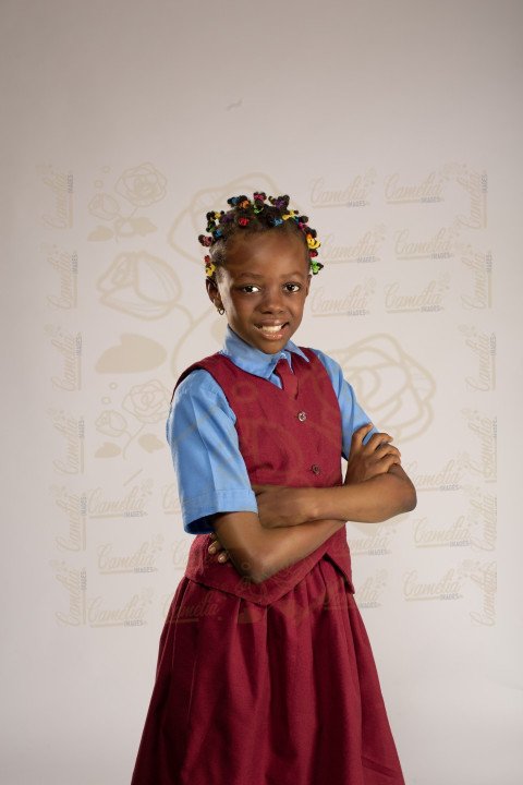 Petite écolière tenue classe couleur bordeaux montre rouge coiffure petits matoba multicolors
