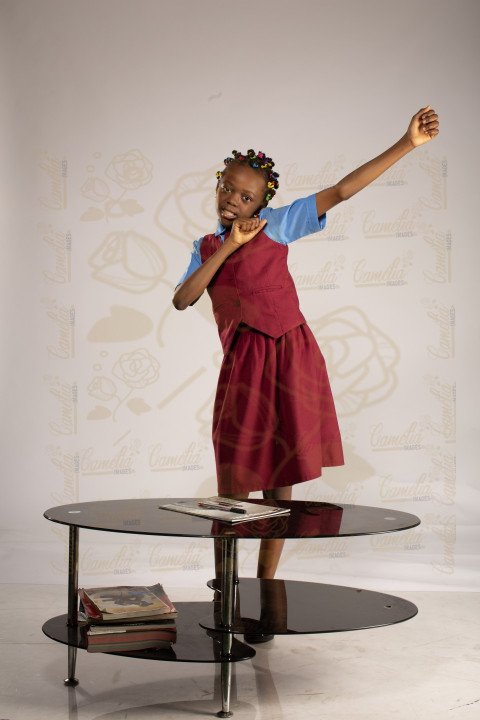 petite écolière africaine tenue classe mains reins jolie gestuel grimasse