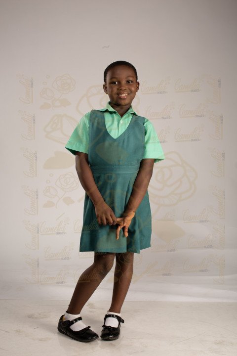 petite écolière africaine tenue classe mains reins jolie gestuel grimasse