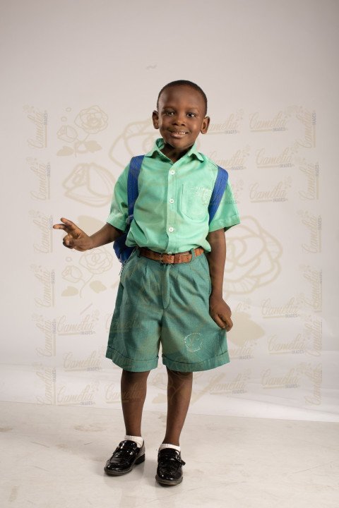 Jeune petit écolier africain tenue classe chemise culote chemin école paire noire