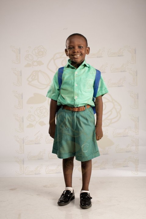petite écolière africaine tenue classe mains reins jolie sourire gestuel grimasse