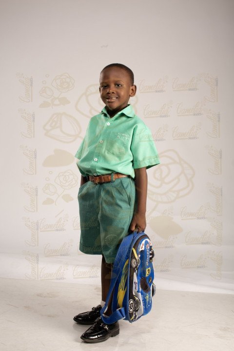 Petit écolier africain danse mains rein grand sourire tenue classe culote verte