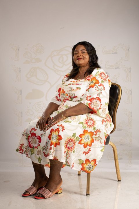 Maman Africaine maquiallage robe fleurit chaise cuir noir