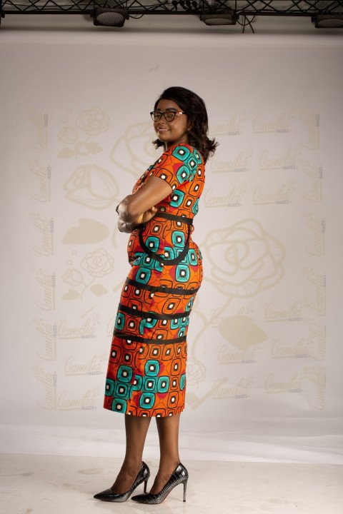 Belle jeune femme noire souriante, vêtue d'une longue robe, prenant une pose élegante avec une chaise haute.