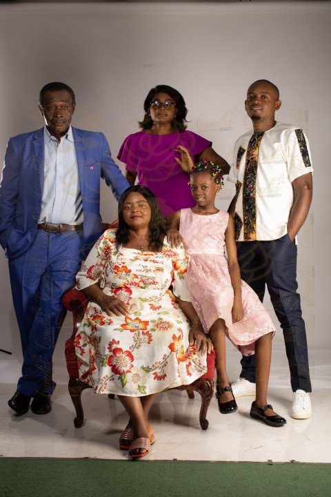 Famille Africaine papa maman fille sourire costume bleu paire noire robe fleur