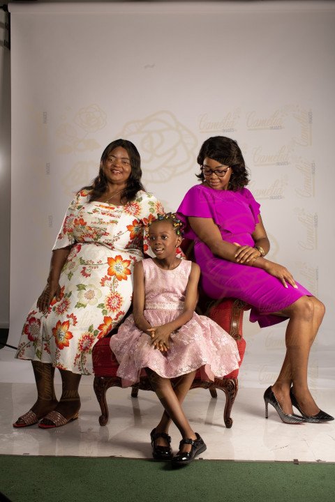 Famille Africaine maman fille grand mère sourire costume bleu paire noire robe fleur