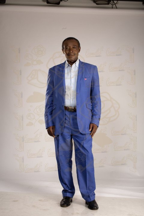 Papa africain sourire ensemble veste bleu ciel paire noire ceinture