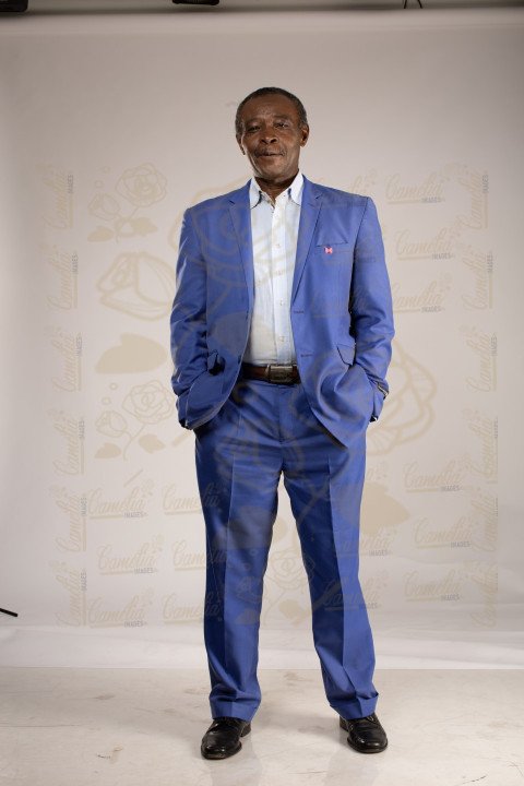 Papa africain grimasse sourire ensemble veste bleu ciel paire noire ceinture mains poches