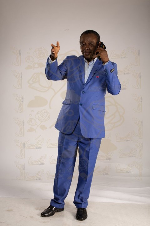 Homme africain élégant costume bleu communication téléphone gestuel mains
