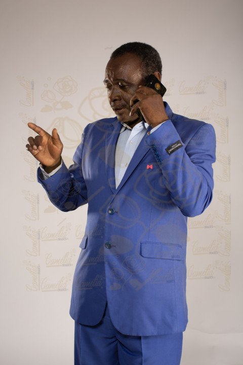 Portrait Homme africain élégant costume bleu communication téléphone gestuel mains