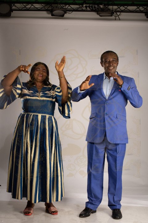 Couple africain age mature sourire élégant costume bleu robe basin gestuel sourire joie