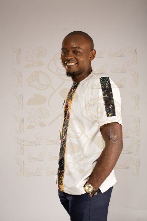 Jeune homme africain teint claire tenue Afrique pantalon noir tennis blanche main poches sourire