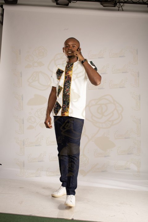 Jeune homme africain teint claire tenue Afrique pantalon noir tennis blanche téléphone