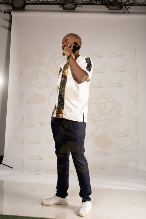 Jeune homme africain teint claire tenue Afrique pantalon noir tennis blanche téléphone