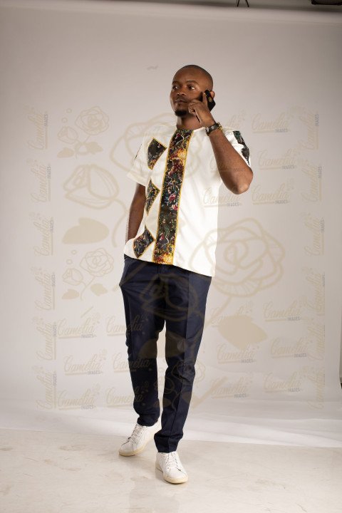 Jeune homme africain teint claire tenue Afrique pantalon noir tennis blanche téléphone