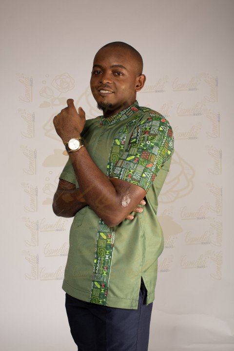 Jeune homme teint claire veste jaune design afrique pantalon noire chaussure blanche