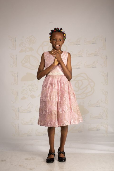 jeune petite fille gestuel applaudis coiffure matoba robe rose chaussure noire