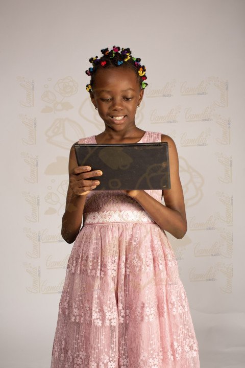 Petite fille Africaine coiffure matoba robe rose chaussure noire tablette