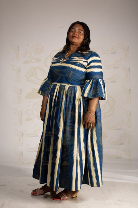 Maman africaine mature rouge lèvres joie sourire robe basin bleu gris