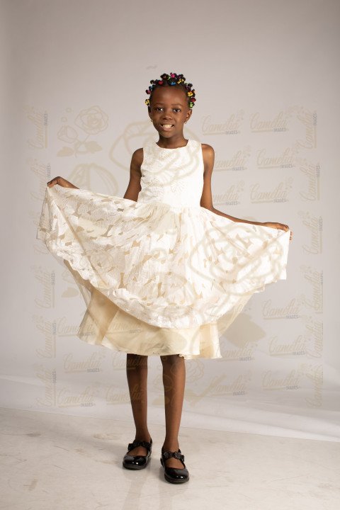 Posture mannequin Jeune petite fille africaine belle expression visage robe blanche fleurs