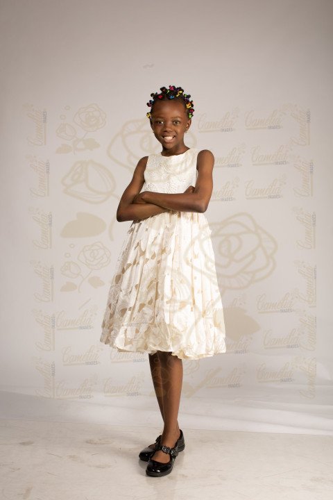 Posture mannequin jolie sourire Jeune petite fille africaine robe blanche fleurs