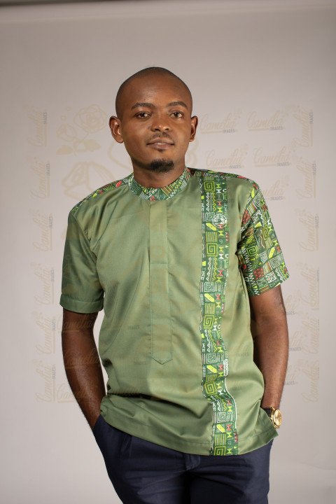 Portrait Jeune homme teint claire veste jaune design afrique pantalon noire chaussure blanche