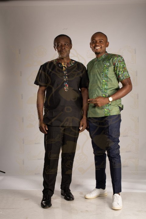 Père et fils teint noire claire paire noire chaussure blanche veste verte grand sourire