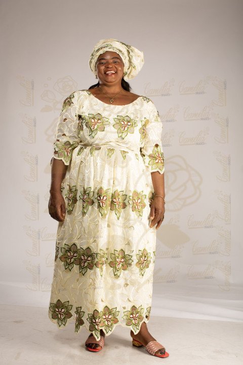 Femme africaine cheveux noire bouquet fleurs jaune vert rose grand sourire