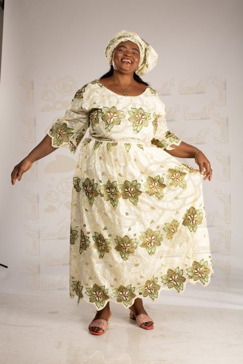 Femme Maman africaine grand sourire gestuel foulard ensemble pagne