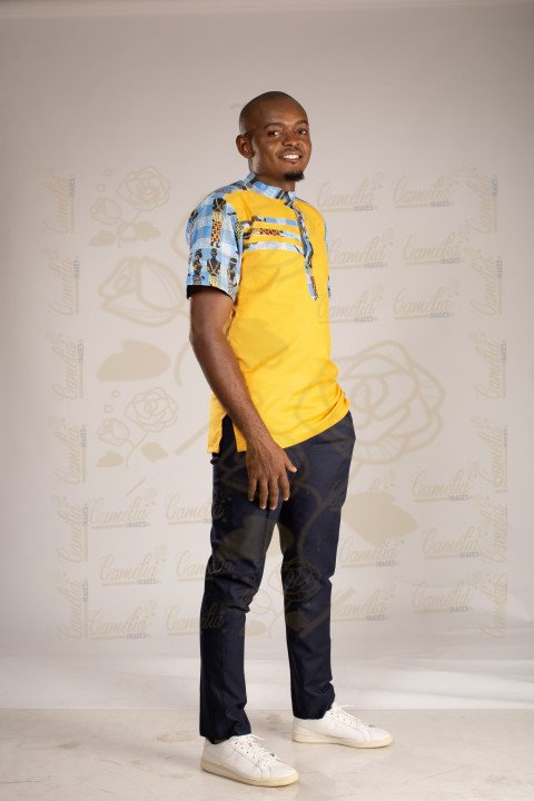 Jeune homme teint claire veste jaune design afrique pantalon noire chaussure blanche